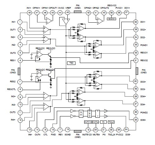 FAN8036L features: (1)4-CH Balanced Transformerless (BTL) Driver; (2)1-CH (Forward Reverse) Control DC Motor Driver; (3)Operating Supply Voltage (4.5V ~ 13.2V); (4)Built in Thermal Shut Down Circuit (TSD); (5)Built in Channel Mute Circuit; (6)Built in Power Save Mode Circuit; (7)Built in TSD Monitor Circuit; (8)Built in 2 Regulators; (9)Built in 2-OP AMPs.