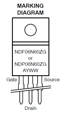 NDF06N60ZG features: (1)Low ON Resistance; (2)Low Gate Charge; (3)100% Avalanche Tested; (4)These Devices are Pb-Free and are RoHS Compliant.